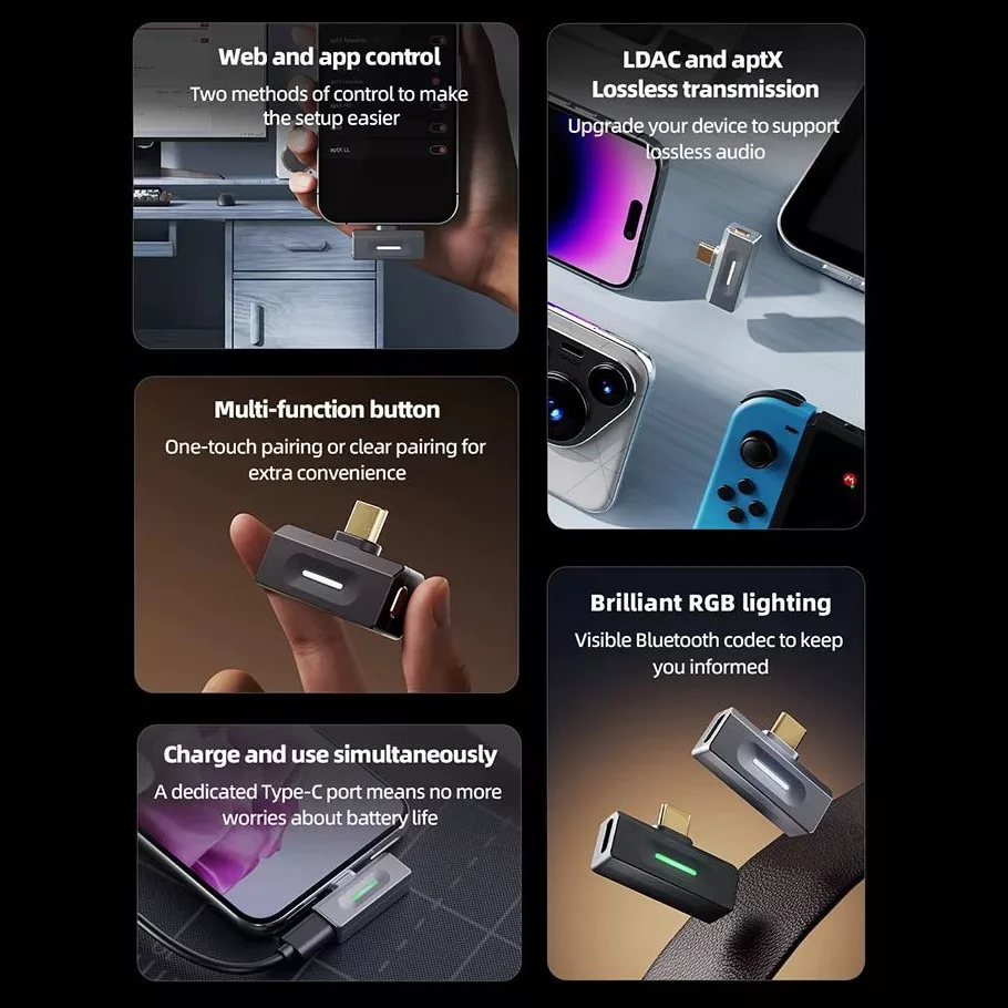 Egyszerű plug-and-play működés: csak bedugod, és már műküdik is. Az AirLink ismeri az LDAC, aptX HD, aptX Adaptive (96 kHz / 24 bit) és aptX Lossless kodekeket. Hi-Res Audio Wireless tanúsítással és LE (Low Energy) Audio támogatással prémium vezeték nélküli hangélményt biztosít, mindössze 50 ms ultraalacsony késleltetéssel.