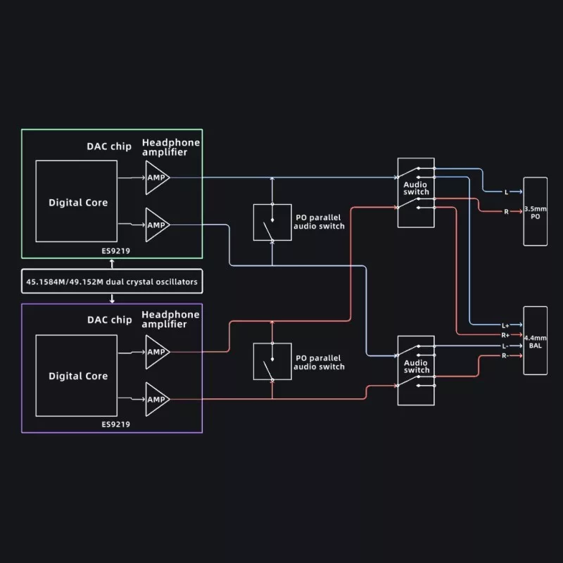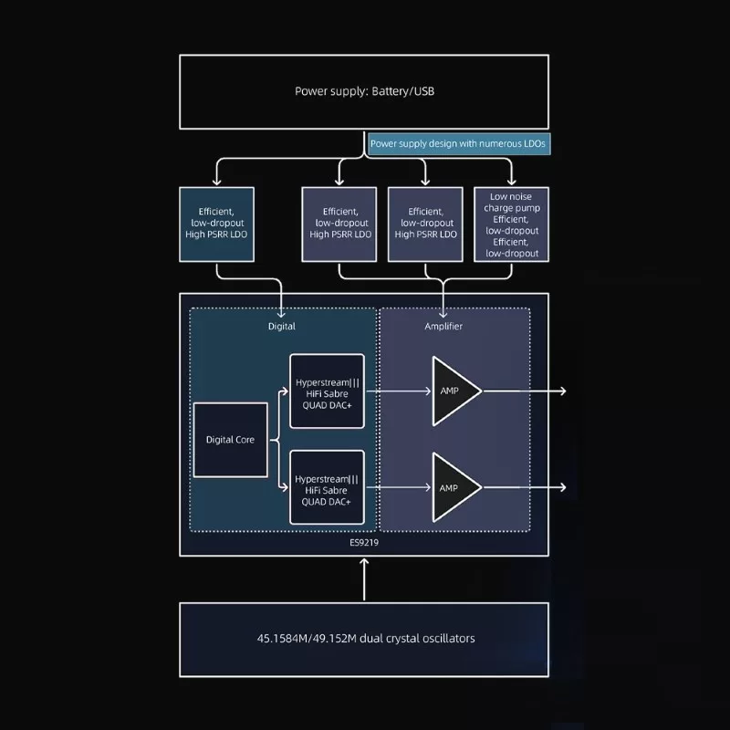 A QCC5125 (Bluetooth) vagy a 16 magox XU316 (USB XMOS) chipek által fogadott digitális jelfolyamot két darab ES9219MQ digitális-analóg átalakító chip alakítja analóg jellé maximum DSD 256 vagy 384 kHz/32 bites minőségben, amellett az MQA formátum feldolgozásra is képes a BTR15. Az analóg modul külön nyomvonalon kapja a tápellátást, így az erősítő a digitális egység zavaraitól védetten, tisztán dolgozik.