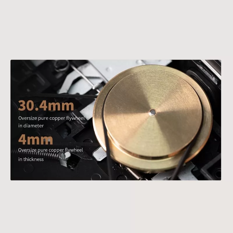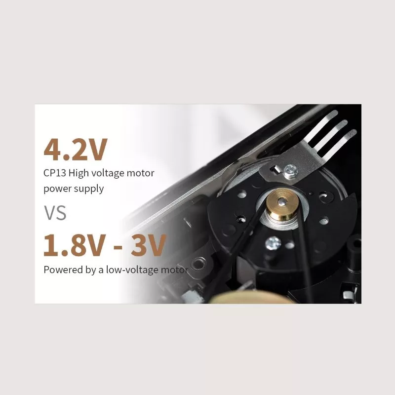 A FiiO CP13 lejátszó szíve egy extra erős, 4.2 voltos motor speciális vezérlő elektronikával. A nyomatékos motor és a hatalmas, réz lendkerék stabil sebességgel mozhatják a szalagot, emiatt a CP13 esetében szinte hallhatatlan a más kazettás lejátszóknál tapasztalható, sebességingadozásból adódó hangmagasság elcsúszás (angolul: wow and flutter).
