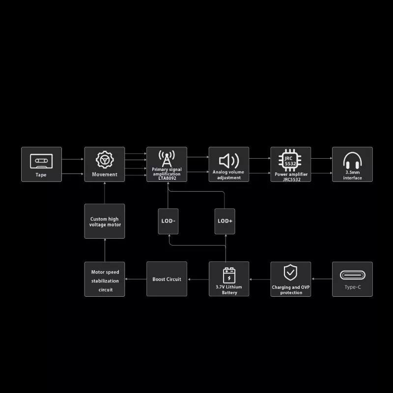 A magnószalagon tárolt zenei anyagot egy érzékeny fej fogadja, amelynek differencál kapcsolású áramköre más kazettás megoldásoknál megszokotthoz képest nagyon magas jel-zaj viszonyt produkál. Az analóg erősítést a közkedvelt JRC5532 chip végzi el, kellő energiához juttatva a fülhallgatódat.
