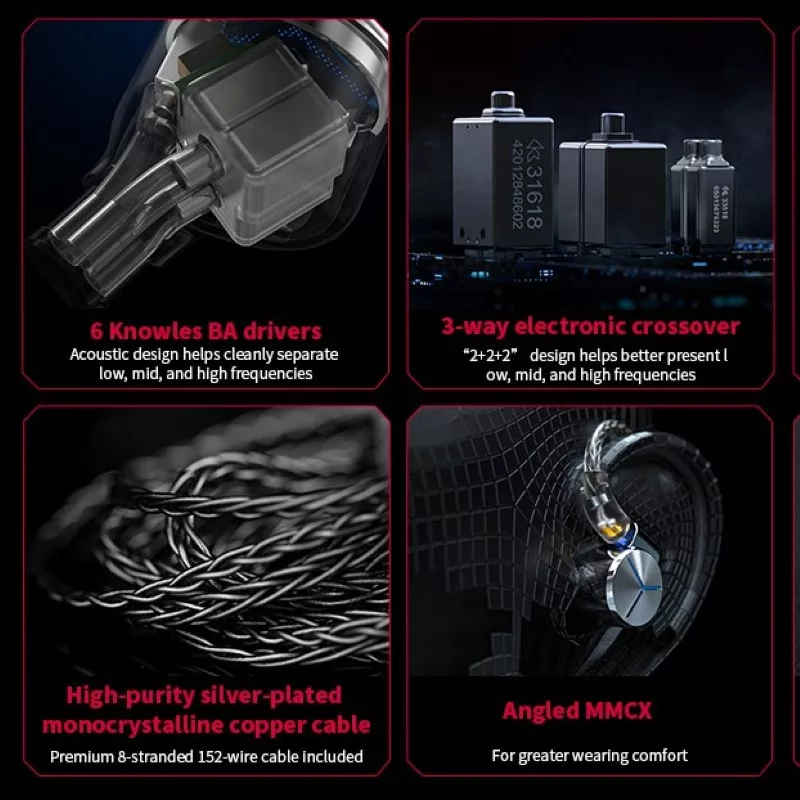 A FiiO FA7s-ben oldalanként 6-6 darab hangkeltő van: A mélyeket megszólaltató Knowles Hodvtec-31618 pár, a közepek tisztaságáért felelős két Dibei-db646006, és a magasak gazdag és részletező hangzásáért dolgozó Knowles RAD-33518-os hangkeltők tökéletes hangverseny érzést varázsolnak a füleidbe.