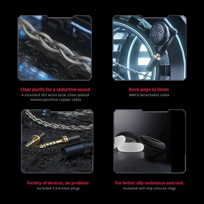 A hangszórók szétpattintható MMCX csatlakozókkal csatlakoznak a kábelhez. A fonott, összesen 392 elemi szálból álló kábel tökéletes hangátvitelt biztosít. A monokristályos réz szálak ezüst bevonatot kaptak, ami nemcsak a külső megjelenésre van jó hatással, hanem a hangminőségre és a tartósságra is. A kábel másik végén lévő, 3.5 mm-es jack csatlakozót kicserélheted a csomagban megtalálható, 4.4 mm-es, szimmetrikus csatlakozóra is, ha olyan lejátszót használsz, amelyen van 4.4-es kimenet.