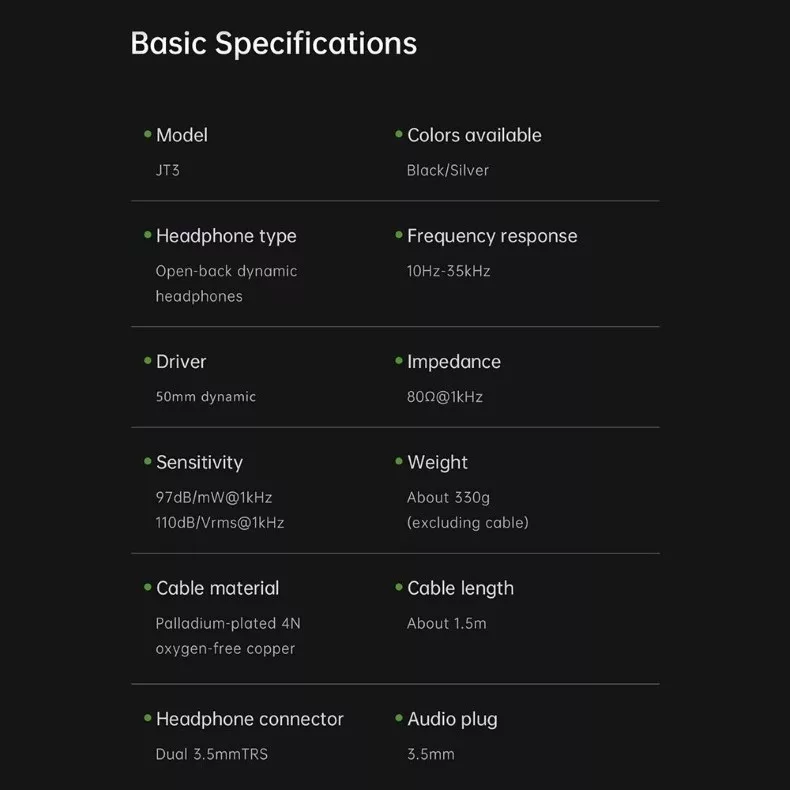 A JT3 nyitott kialakítást használ, hogy a természetes zenehallgatási környezet érzetét keltse. Ez a felépítés hatékonyan szünteti meg a zárt fejhallgatókra jellemző nyomásfelhalmozódást és az állóhullámokat, széles és magával ragadó színpadképet nyújtva neked, tűpontos hangelhelyezéssel.
