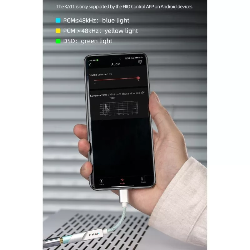 Az androidos telefonokra ingyenesen elérhető FiiO Control app segítségével beállíthatod a kívánt UAC1.0 vagy 2.0 módot, kikapcsolhatod a státusz fényt és beállíthatod a kívánt hangzást.