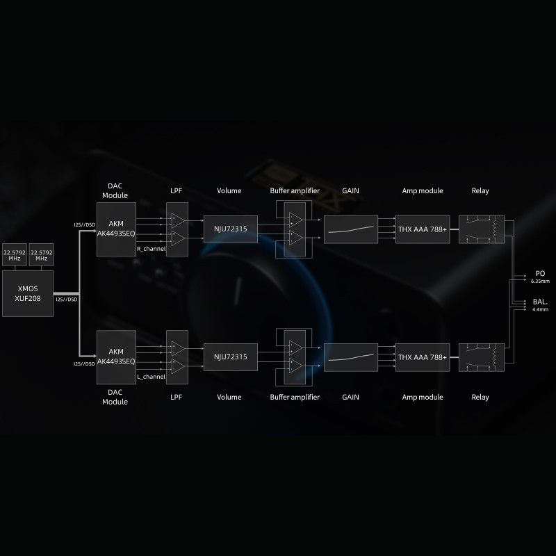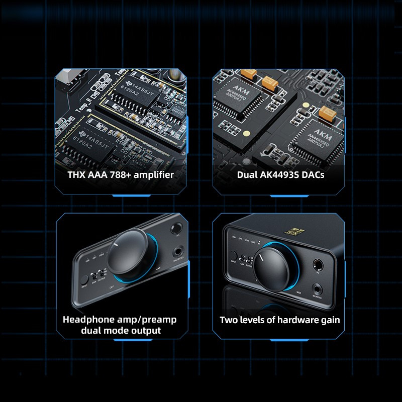 - A K9 Pro asztali erősítőhöz kifejlesztett THX-AAA 788+ chip pár elképesztő tisztasággal erősíti a kívánt jelszinte az analóg hangjelet. A kimenő teljesítmény 2000 mW (32 ohmos terheléssel) vagy 560 mW (300 ohmos terhelés mellett). Ez a teljesítmény akár a magas impedanciás, stúdió fejhallgatók meghajtásához alkalmas.
