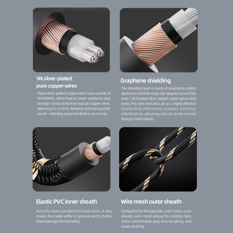 A nagy sűrűségű polietilén (HDPE) szigetelő külső oldalán a vezetőszálakat dupla árnyékolás védi: az alumínium fóliára felvitt grafén rétegen kívül egy ónozott rézből álló köpeny gondoskodik a zavarok elleni, 360 fokos védelemről.