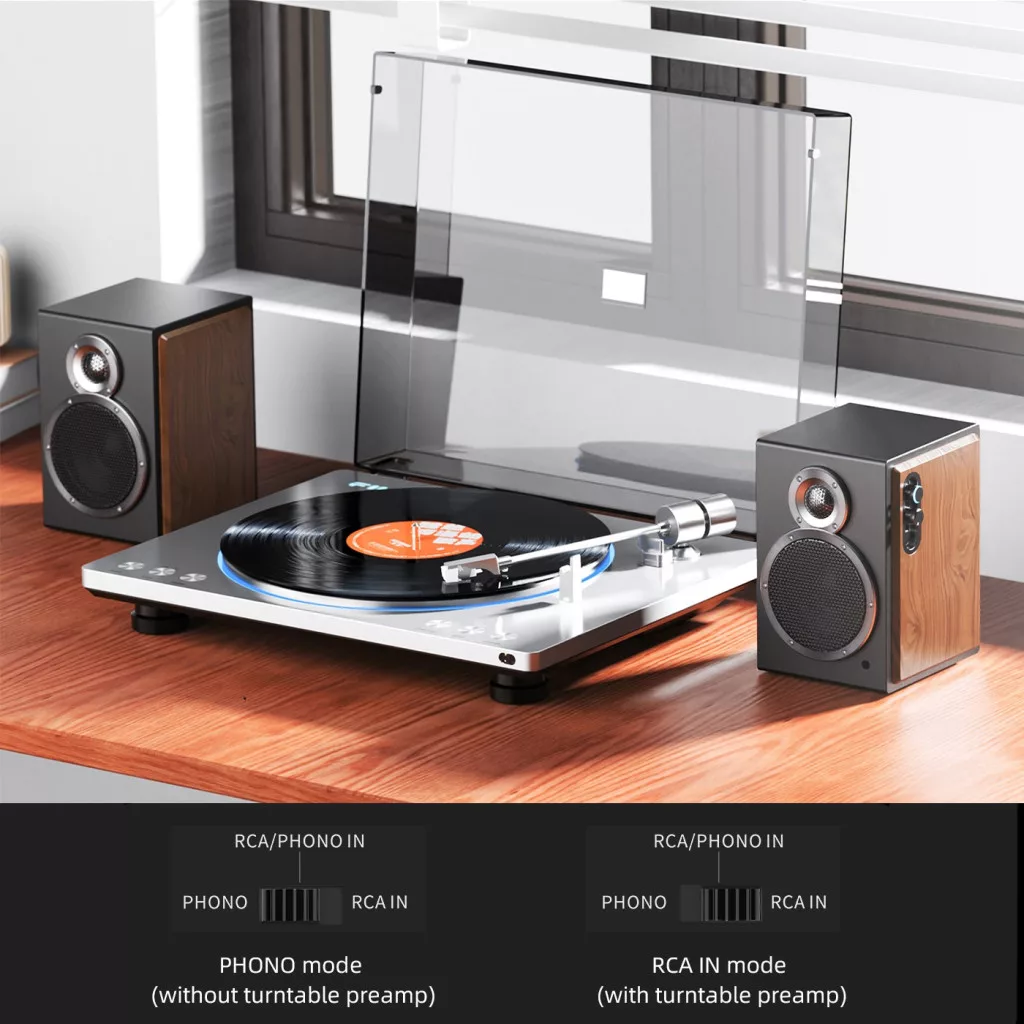Az SA1 beépített phono előerősítőjét szabványos RIAA hangszínszabályzóval látták el, hogy biztosítsa a hanglemezek hangjának hű visszaadását. Ha beépített előerősítő nélküli lemezjátszót használsz (vagyis ha a lemezjátszó csak phono-out kimenettel rendelkezik), átkapcsolhatod az SA1-et a PHONO beállításra a belső SA1 phono előerősítő használatához. Ha a lemezjátszó már rendelkezik beépített előerősítővel (mint pl. a FIIO TT13), egyszerűen kapcsold a bemeneti kapcsolót RCA IN állásba.
