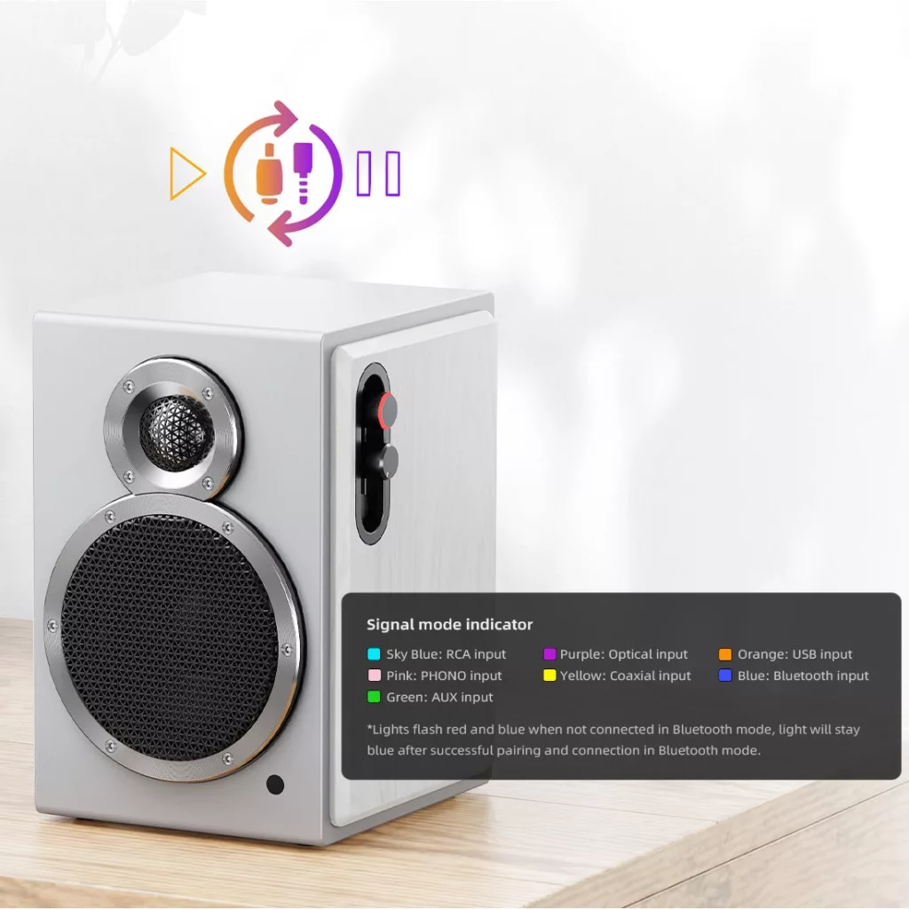 A FiiO SA1 hangszóró működését a főegység jobb oldalán elhelyezett gombokkal irányíthatod. A fenti tekerőgomb benyomásával kiválaszthatod a kívánt bemenetet, a gomb eltekerésével beállíthatod a hangerőt. A hangerőszabályozót körülvevő led színe a bemenettől és a dekódolási jellemzőktől függően változik. A középső gombbal a basszust szabályozhatod. Az alsó gombbal tudod be- és kikapcsolni az SA1-et.