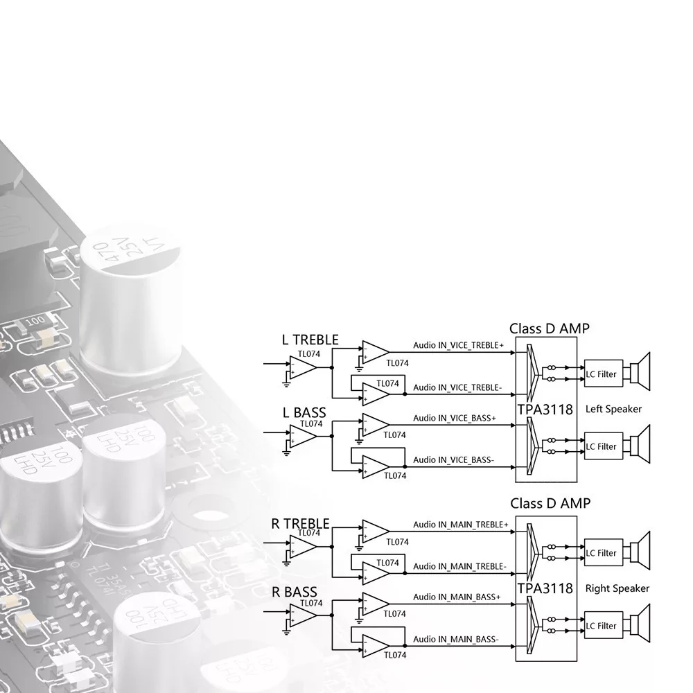 Az SA1 a FiiO SP3/SP3 BT hangfalakhoz hasonlóan két darab Texas Instruments TI TPA3118 Class D digitális erősítő chippel van felszerelve. A TPA 3118 magas konverziós hatékonysággal és alacsony zajszinttel rendelkezik, ami biztosítja az audiojel tisztaságát.