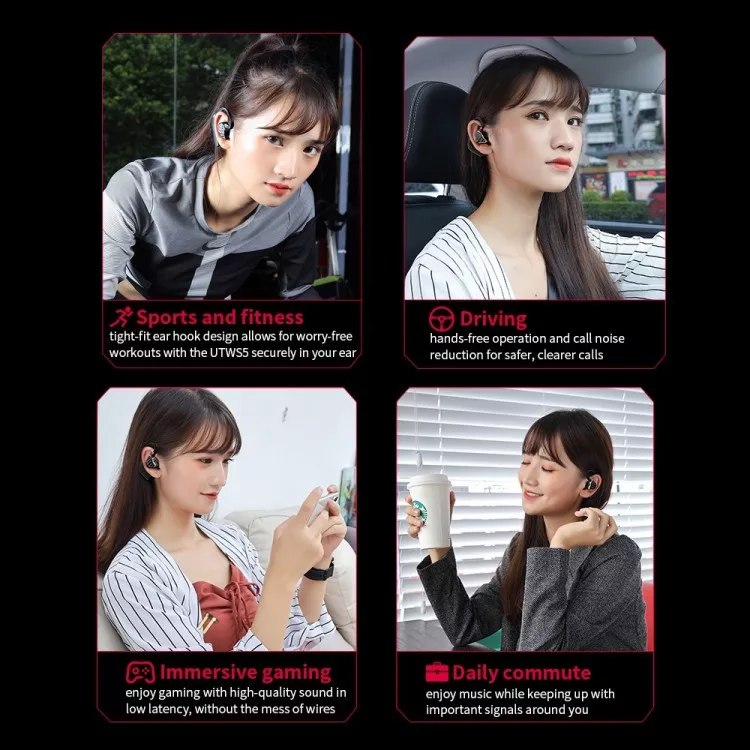 Az UTWS5 Bluetooth vevő pehely súlya miatt társad lehet otthon, vezetés, sportolás vagy akár utazás közben. A kényelmes viseletről az emlékező fémből formázott, fülhöz rögzíthető, kampós kialakítás gondoskodik. Az IPX4 vízállóságú, fröccsenő víztől védett ház megvédi az eszközt az izzadságtól, és akkor sem romlik el, ha ráéesik egy pár csepp eső. A mikrofonok védelmét vízálló membránok látják el.