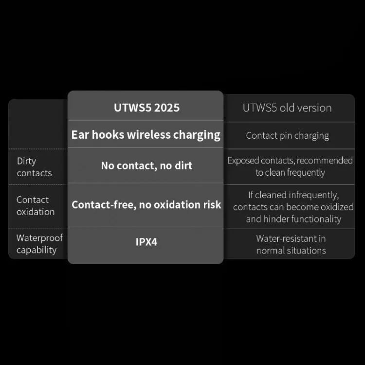 Az UTWS5 2025-ös változata a korábbihoz képest vezetékmentes fülhorog töltést és látványosabb jobb-bal (R-L) jelölést kapott.