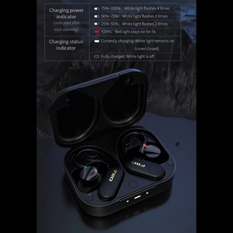 Az UTWS5 Bluetooth vevő pár egy alumínium töltő tokban érkezik meg hozzád. Az első használat előtt csatlakoztasd a tokot egy USB töltőhöz a mellékelt kábel segítségével! A vevő párt a tok látja el töltéssel. Az UTWS5 (2025) modellben a korábbi, fülhorog töltésére használt fém csatlakozót felváltotta egy induktív töltési megoldás. Így azok a sportolók is tovább élvezhetik a FiiO fülhorgok használatát, akiknél korábban a nagy mennyiségű izzadság vagy esővíz a csatlakozók korróziójához vezetett.